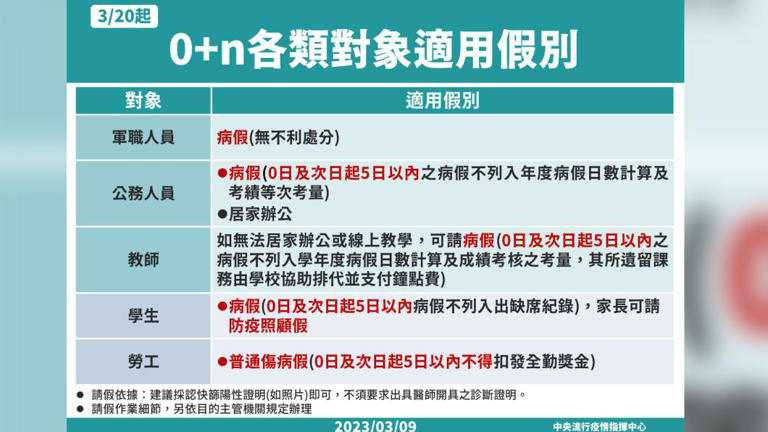 3月20日起0+n各類對象適用假別。(圖/中央流行疫情指揮中心)