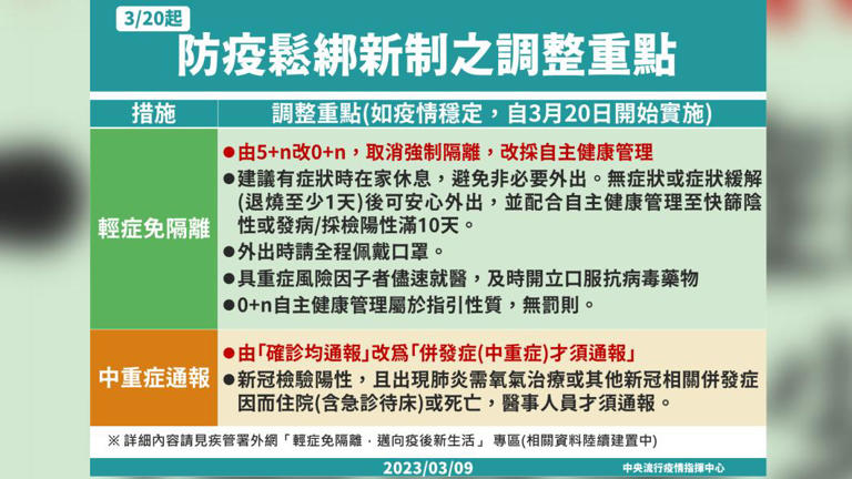 20日後防疫規範鬆綁,由「確診皆須通報」改為「併發症(中重症)才須通報,屆時有發燒或有呼吸道症狀,或是14天內患者出現肺炎需氧氣治療或其他併發症,而中重症患者,或是重症如住院、急診待床或死亡才需要通報,輕症患者則免。